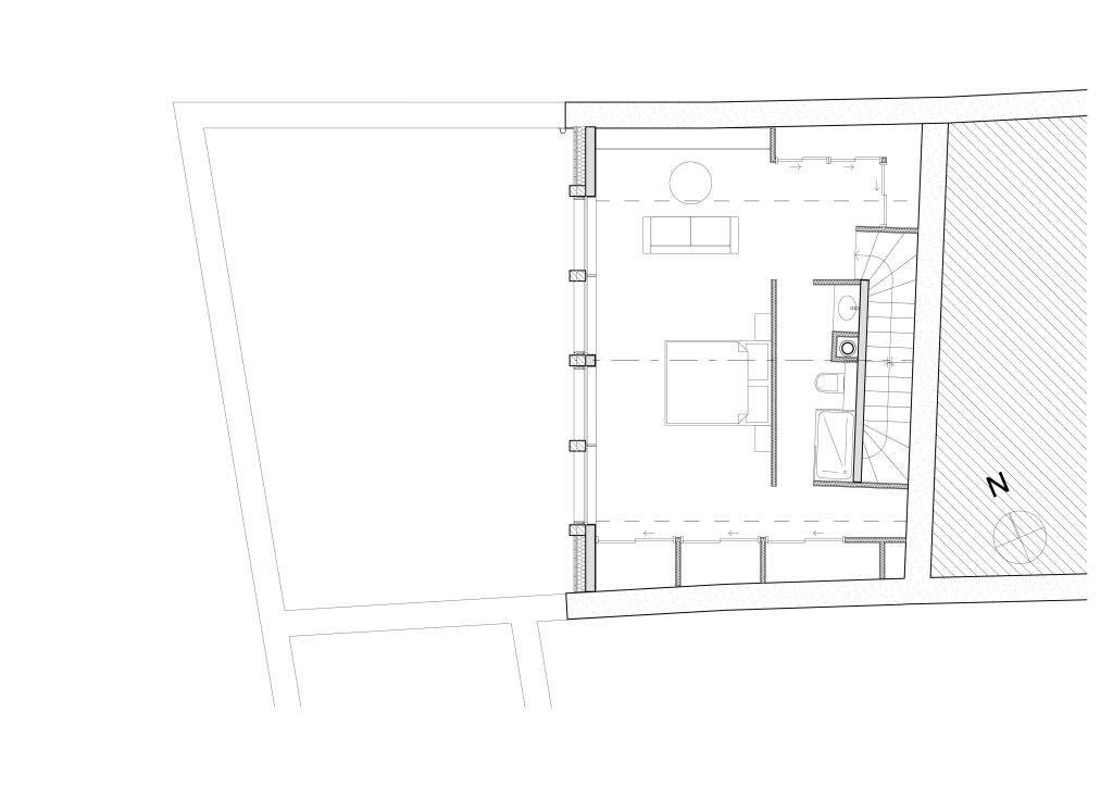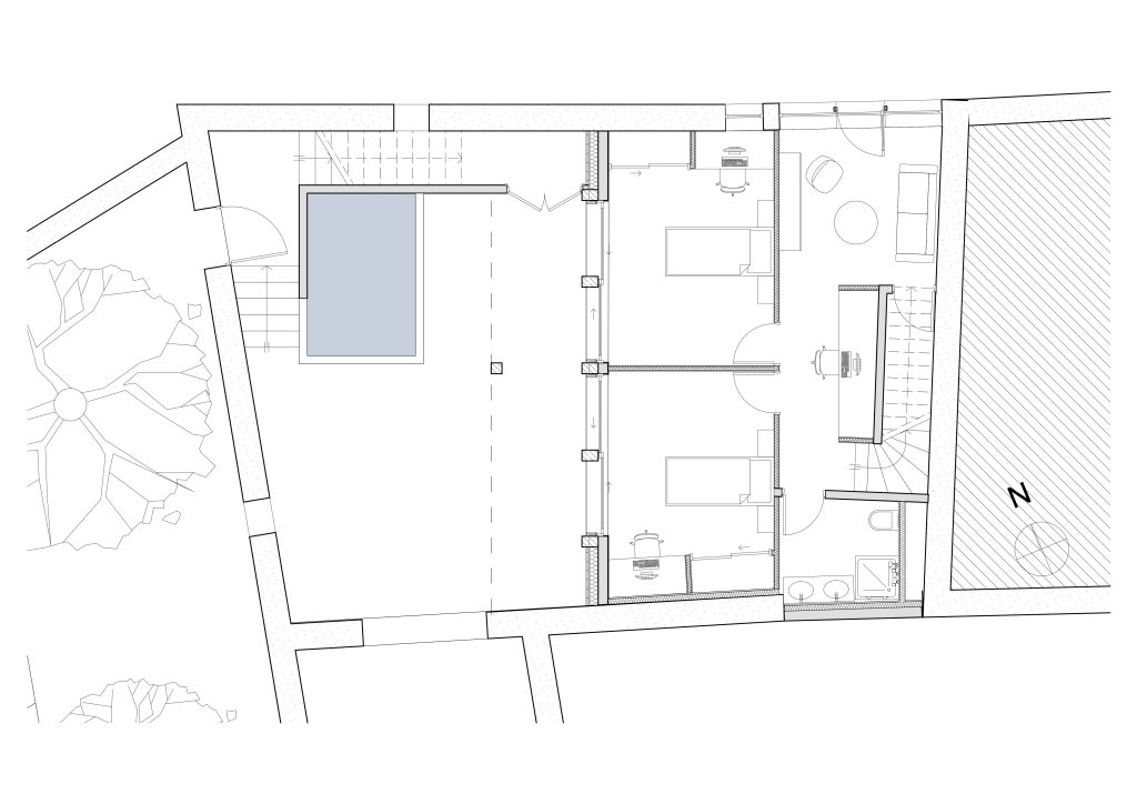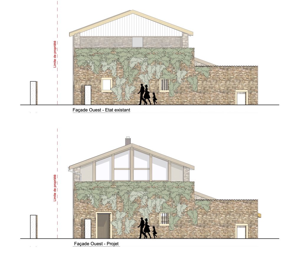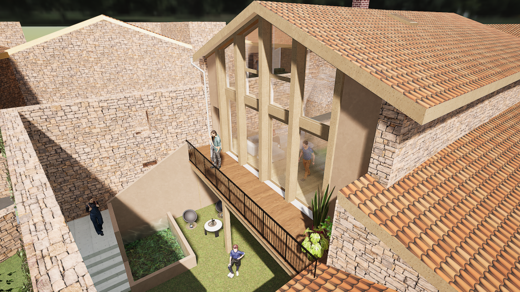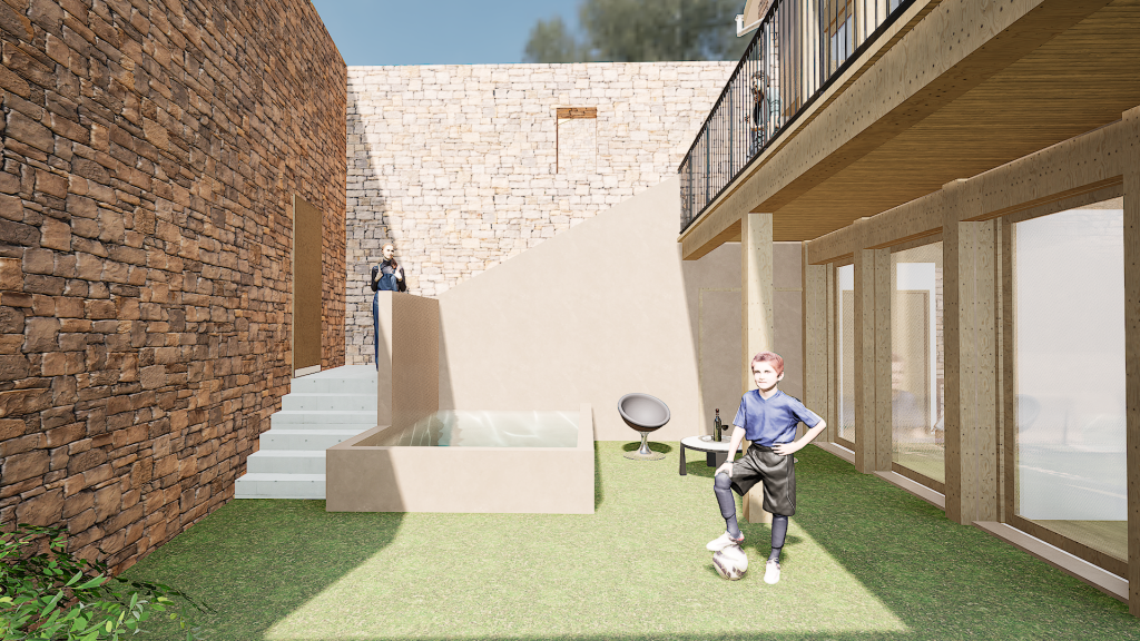 Situé au cœur du Beaujolais, dans le village de Frontenas, ce projet architectural tire parti du patrimoine local des pierres dorées en réhabilitant un site en ruines. Le concept consiste à préserver les murs en pierre existants pour intégrer une structure habitable de trois niveaux. L’emprise des murs d’origine permet également la création d’un patio, autour duquel s’articulent un jardin, un escalier d’accès et une petite piscine, formant ainsi un espace extérieur à la fois protégé et intime.