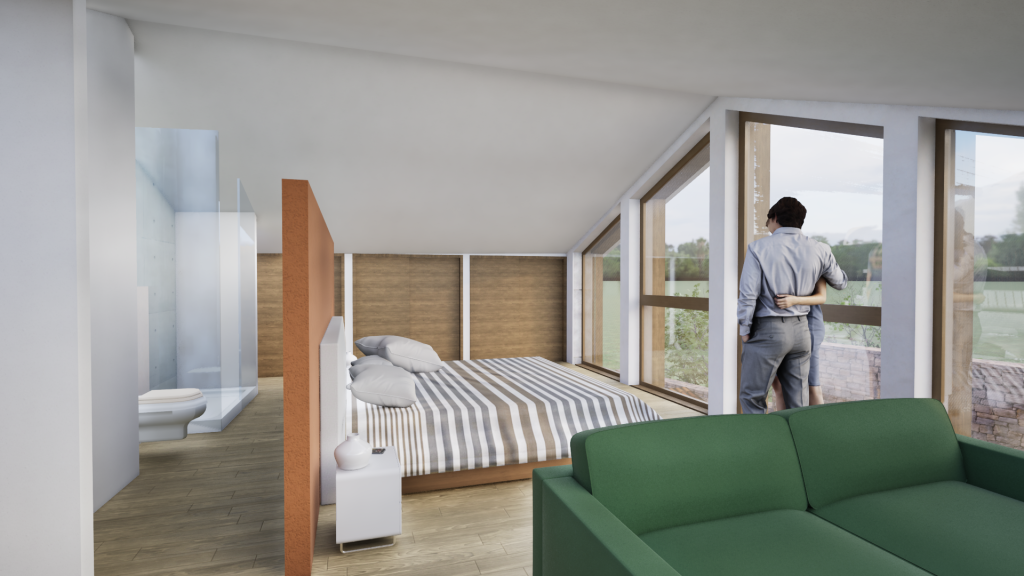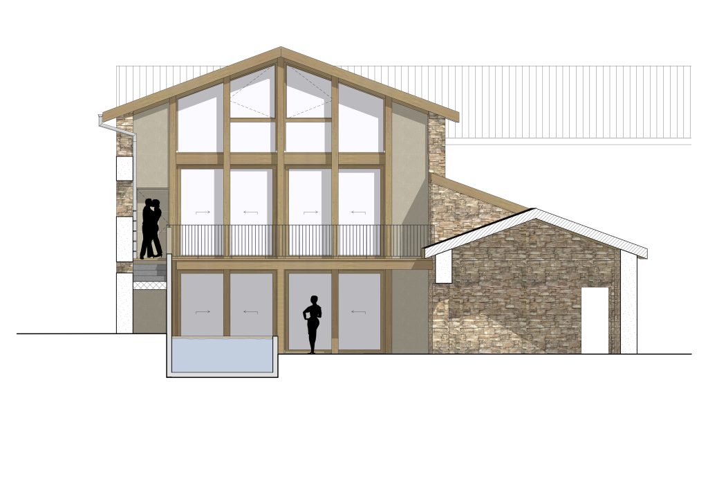 La construction repose sur des planchers en maçonnerie pour assurer la stabilité des murs en pierre, et intègre une façade en ossature bois. Cette façade est conçue avec un remplissage central en vitrage pour maximiser la lumière naturelle, tandis que les sections latérales sont isolées avec un mélange chaux-chanvre, recouvert d’un enduit à la chaux. Les menuiseries en bois ajoutent une touche cohérente avec l’esthétique traditionnelle